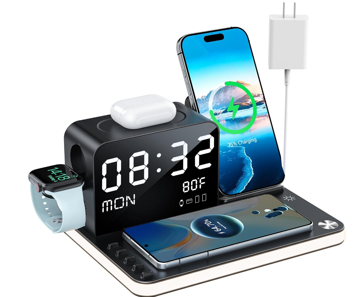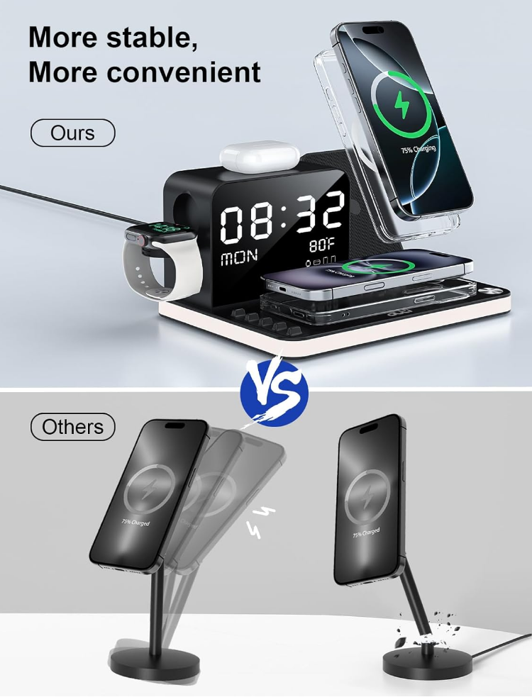 - 5.Perfect iPhone Charging Station Choice: This charging station is compatible with the entire iPhone 16/15/14/13/12/11 series, Android smartphones, wireless earbuds (such as AirPods 3/2/Pro 1/Pro 2), Apple Watches, and tablets. Compared to other bulky, unstable, and less functional phone charging stations, this one is lightweight, sturdy, and powerful, making it the ideal choice for charging multiple devices. Whether in your bedroom, kitchen, living room, study, office, or even while traveling, you can easily charge all your devices anytime, anywhere